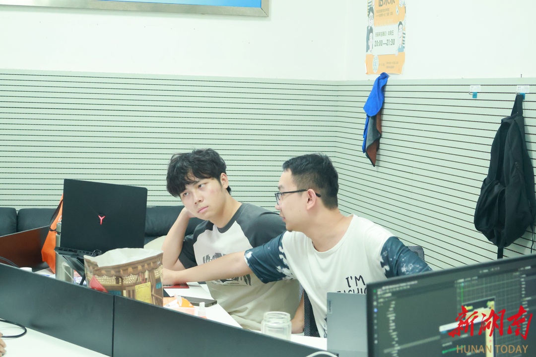 走进衡阳师范学院创业园,道芯融创文化科技有限公司内,几张桌子紧凑地拼在一起。谭龙飞与团队成员环桌而坐,指尖在键盘上跃动,时而凝神思考,时而就项目问题低声交换意见。
